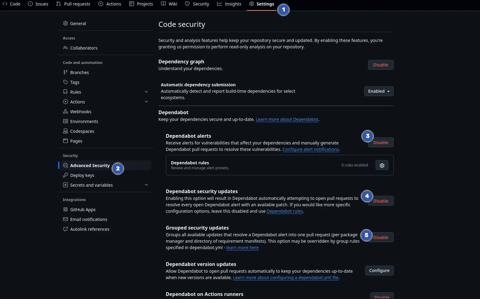 Sous la section “Security”, activez les alertes Dependabot, les mises à jour de sécurité et les mises à jour de version.