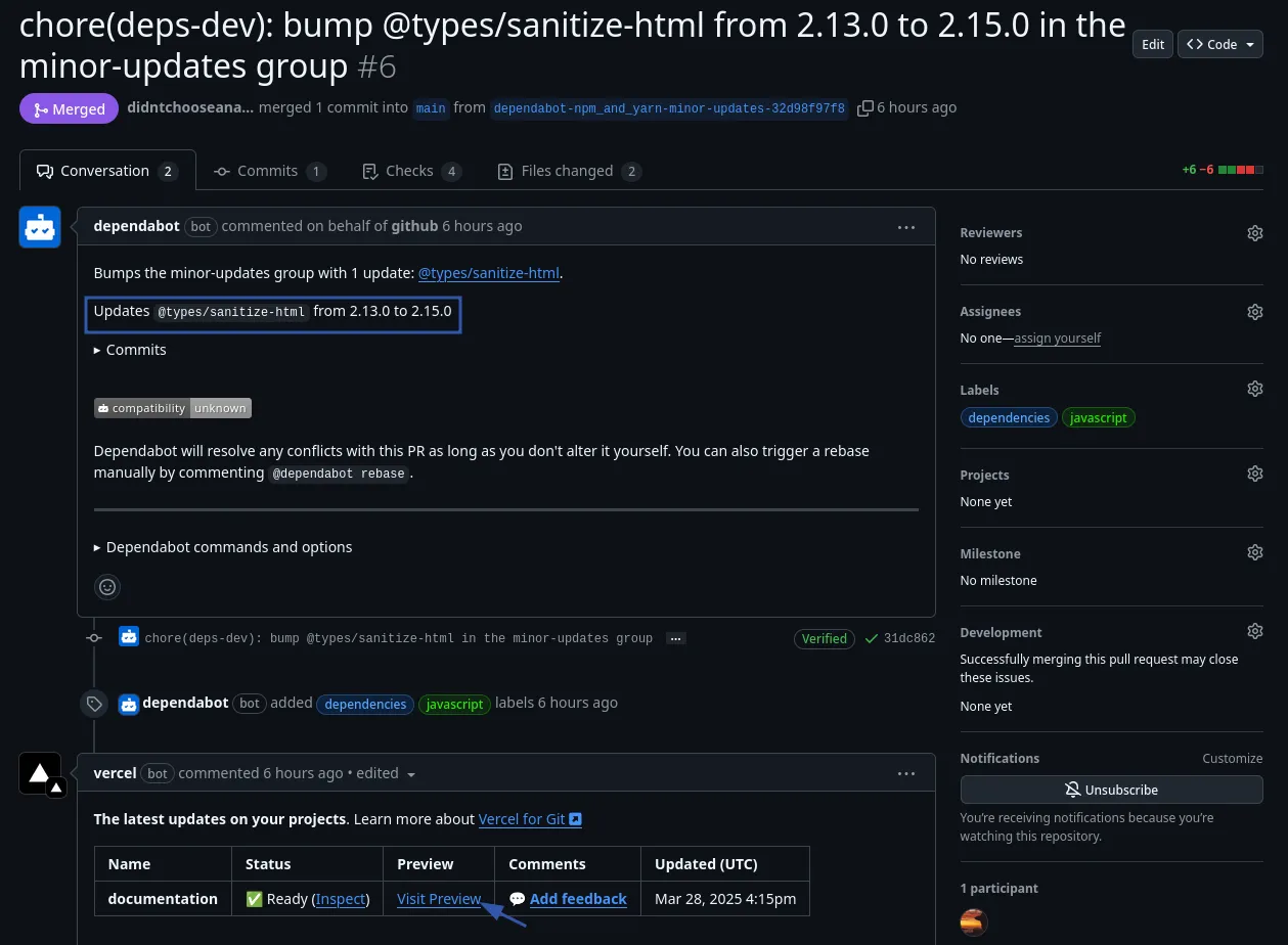 version: 2updates: - package-ecosystem: "npm" directory: "/" schedule: interval: "daily" groups: patch-updates: patterns: - "*" update-types: - "patch" minor-updates: patterns: - "*" update-types: - "minor" pull-request-branch-name: separator: "-" ignore: - dependency-name: "*" update-types: ["version-update:semver-major"]Cette configuration garantit que les mises à jour de dépendances sont révisées et créent une pull request avec prévisualisation vercel, maintenant votre projet sécurisé et à jour sans modifier les fichiers vous-même et avoir un aperçu en direct et automatisé du site web avec les modifications par dependabot :