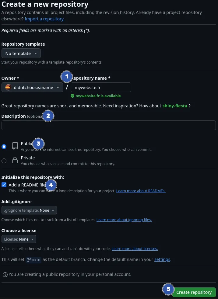 - Nommez votre dépôt (idéalement correspondant à votre nom de domaine)