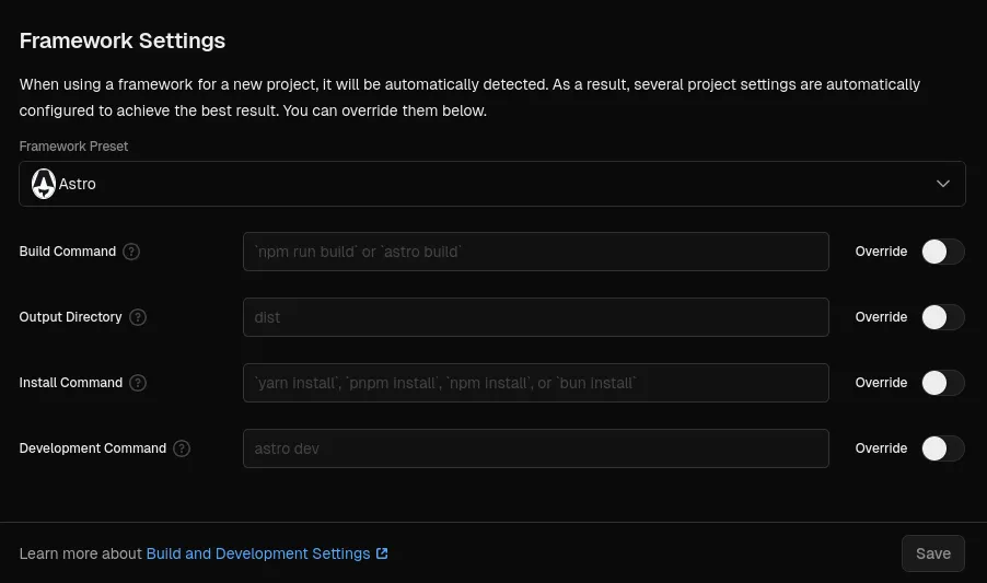 Définissez le preset de framework (si applicable, astro sera automatiquement détecté)