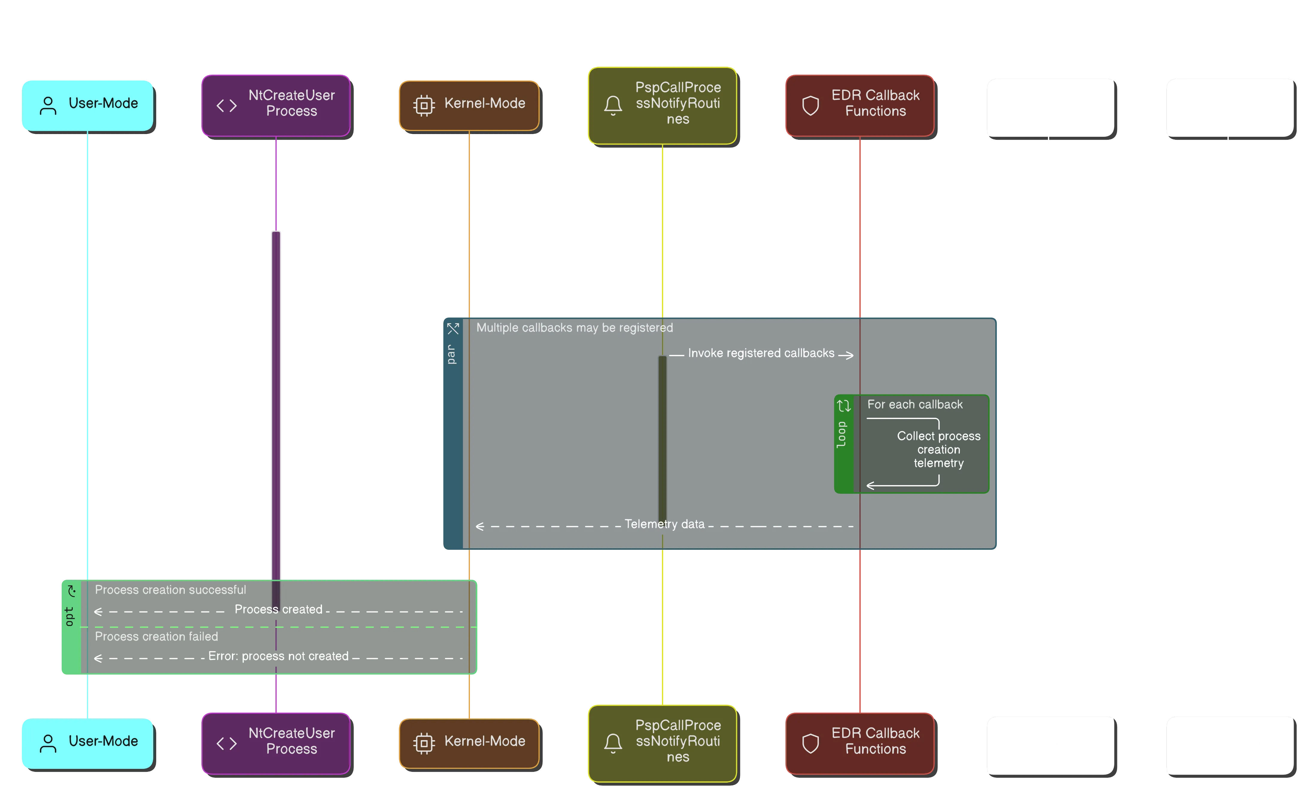 La surveillance de la création de processus est fondamentale pour la fonctionnalité EDR. Ces callbacks notifient les pilotes chaque fois qu’un processus est créé ou terminé sur le système, permettant aux EDR de collecter la télémétrie initiale sur les activités de création de processus potentiellement malveillantes.