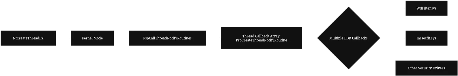 La surveillance de la création de threads complète la surveillance des processus en fournissant une visibilité sur l’exécution du code au sein des processus. Les EDR enregistrent des callbacks de création de threads pour détecter des techniques comme l’injection de thread distant.