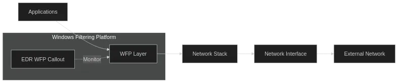 Les EDR exploitent typiquement la Windows Filtering Platform (WFP) pour intercepter et analyser le trafic réseau. WFP fournit un ensemble d’API et de mécanismes de filtrage qui permettent aux produits de sécurité de surveiller et contrôler le trafic réseau à diverses couches de la pile réseau. Les EDR enregistrent des callouts qui sont invoqués lorsque le trafic réseau correspond à des conditions spécifiques, leur permettant de collecter la télémétrie sur les connexions suspectes, les transferts de données et les anomalies de protocole.