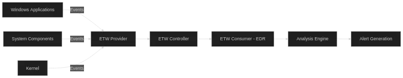 Event Tracing for Windows (ETW) est une autre source de télémétrie cruciale pour les EDR. ETW fournit un mécanisme de traçage à l’échelle du système qui permet la surveillance des activités en mode utilisateur et en mode noyau avec un impact minimal sur les performances.