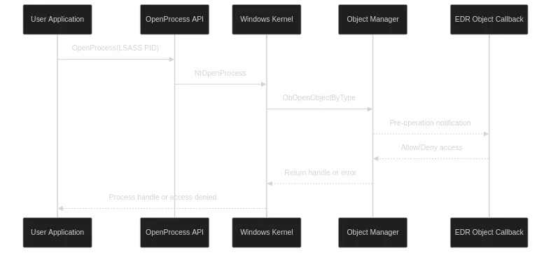 Ces callbacks collectent la télémétrie telle que les ID de processus cible et source, les droits d’accès demandés et l’ID du thread initiant la création ou duplication de handle. Les EDR utilisent ces informations pour empêcher les tentatives d’accès aux processus sensibles, telles que celles ciblant LSASS pour le dumping d’identifiants.