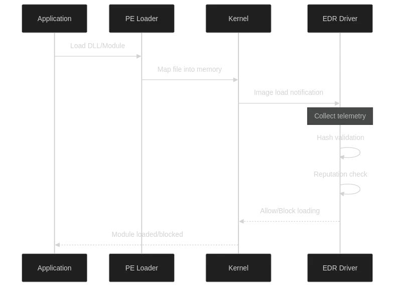 Les callbacks de chargement d’image notifient les pilotes chaque fois qu’un fichier PE (exécutable, DLL ou pilote) est chargé en mémoire. Cela fournit aux EDR une visibilité sur les modules de code introduits dans les processus.