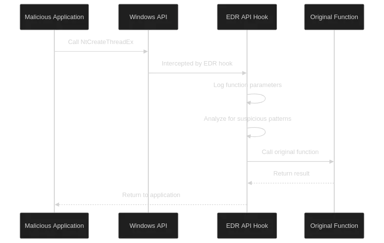 Les EDR hookent typiquement les API Windows critiques, particulièrement dans le module NTDLL.DLL, pour surveiller les activités suspectes. Le processus de hooking implique de modifier le point d’entrée de la fonction pour rediriger l’exécution vers le code de surveillance de l’EDR avant de passer le contrôle à la fonction originale. Cela permet aux EDR de collecter une télémétrie détaillée sur les paramètres d’API, les valeurs de retour et les piles d’appels, ce qui peut révéler une intention malveillante même lorsque des API Windows légitimes sont utilisées à des fins néfastes.