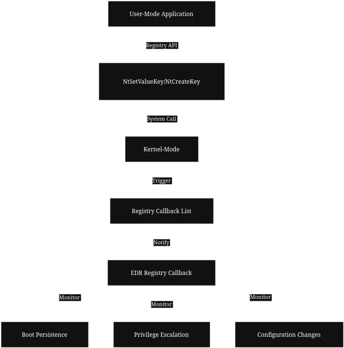 Ces callbacks suivent les opérations telles que la lecture, l’écriture, la suppression ou l’interrogation des clés de registre. La télémétrie inclut le chemin complet de la clé de registre, l’ID de processus et l’ID de thread du processus effectuant l’opération, et les détails sur l’opération demandée. Les EDR analysent ces données pour détecter les techniques de persistence communes des malwares, les tentatives d’escalade de privilèges et les activités d’évasion de défense.