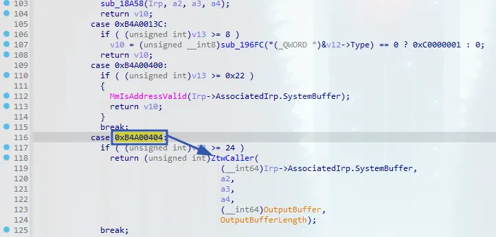 That led us to a dispatch function containing a switch statement that handles different IOCTL codes. We can now identify which IOCTL code triggers our process termination function: