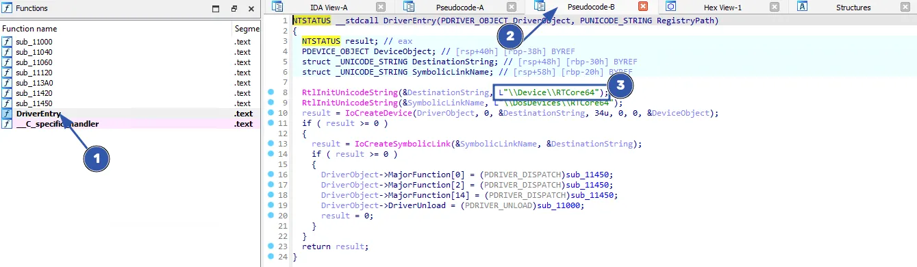 From IDA Pro, we’ve loaded the RTCore64.sys driver and navigated to the DriverEntry function, which reveals the device name the driver will create.