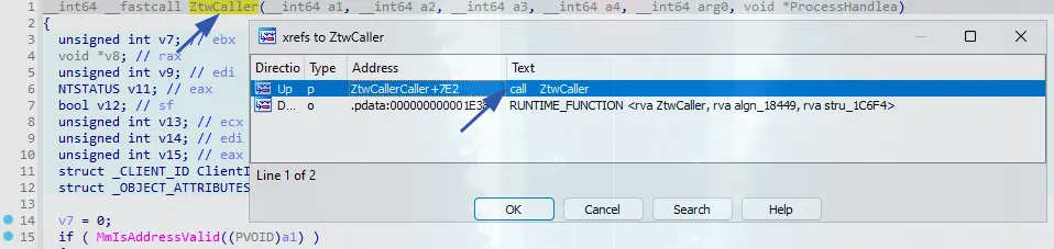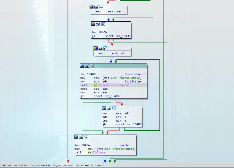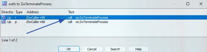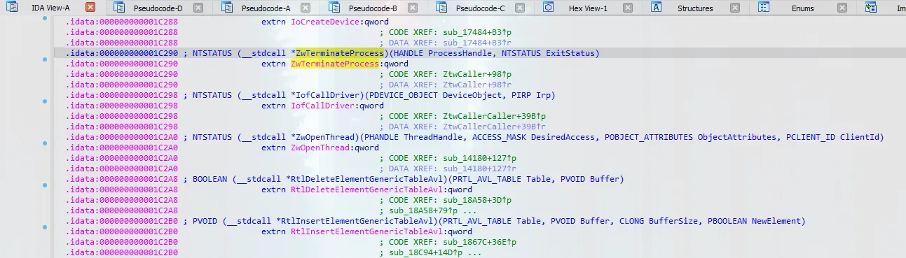 Since our goal is to find a way to terminate EDR processes, we’re specifically looking for the ZwTerminateProcess function. Let’s load another view to search for this API: