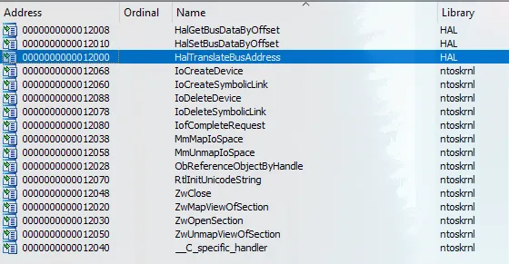 Imports tab shows various kernel-mode functions available to the driver: