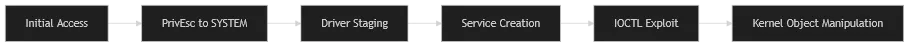 The attack chain begins with obtaining administrative privileges, typically through credential theft or privilege escalation vulnerabilities. Once elevated access is secured, the attacker deploys a vulnerable driver often one deprecated but still signed to the target system. Legitimate drivers from security vendors (e.g., anti-malware tools) are frequent targets due to their inherent permissions to interact with system processes.