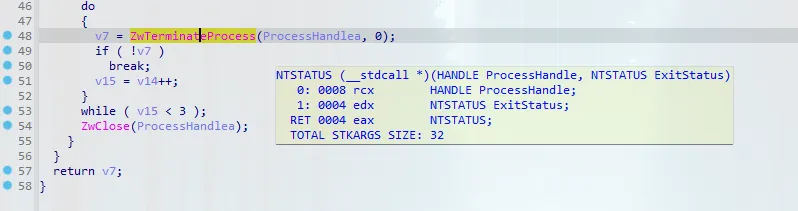 After renaming variables for clarity, we can see the function accepts a process handle parameter and passes it directly to ZwTerminateProcess: