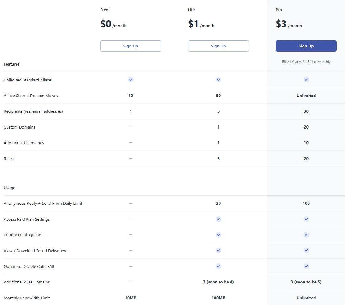 SimpleLogin offers more features compared to its competitors. Additionally, the service was acquired by Proton and is free (with premium) for subscribers.